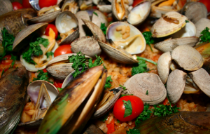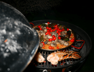 Add clams, mussels and remaining tomatoes to the paella pan and cover the grill. Cook for 10 minutes, checking occasionally to see if the clam and mussel shells have opened.