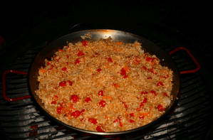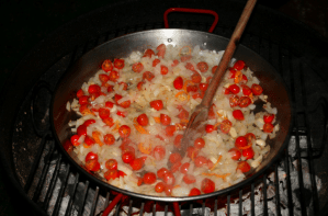 Place the paella pan on the heated grill and add the olive oil. Add chopped onions, garlic and the 2 cups of cut tomatoes. Stir occasionally until onions are softened, about 5 to 8 minutes.
