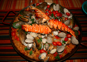 Remove lobster tails from grill and serve on top of a platter with the paella. Sprinkle with chopped parsley and lemon juice and garnish plate with lemon wedges.