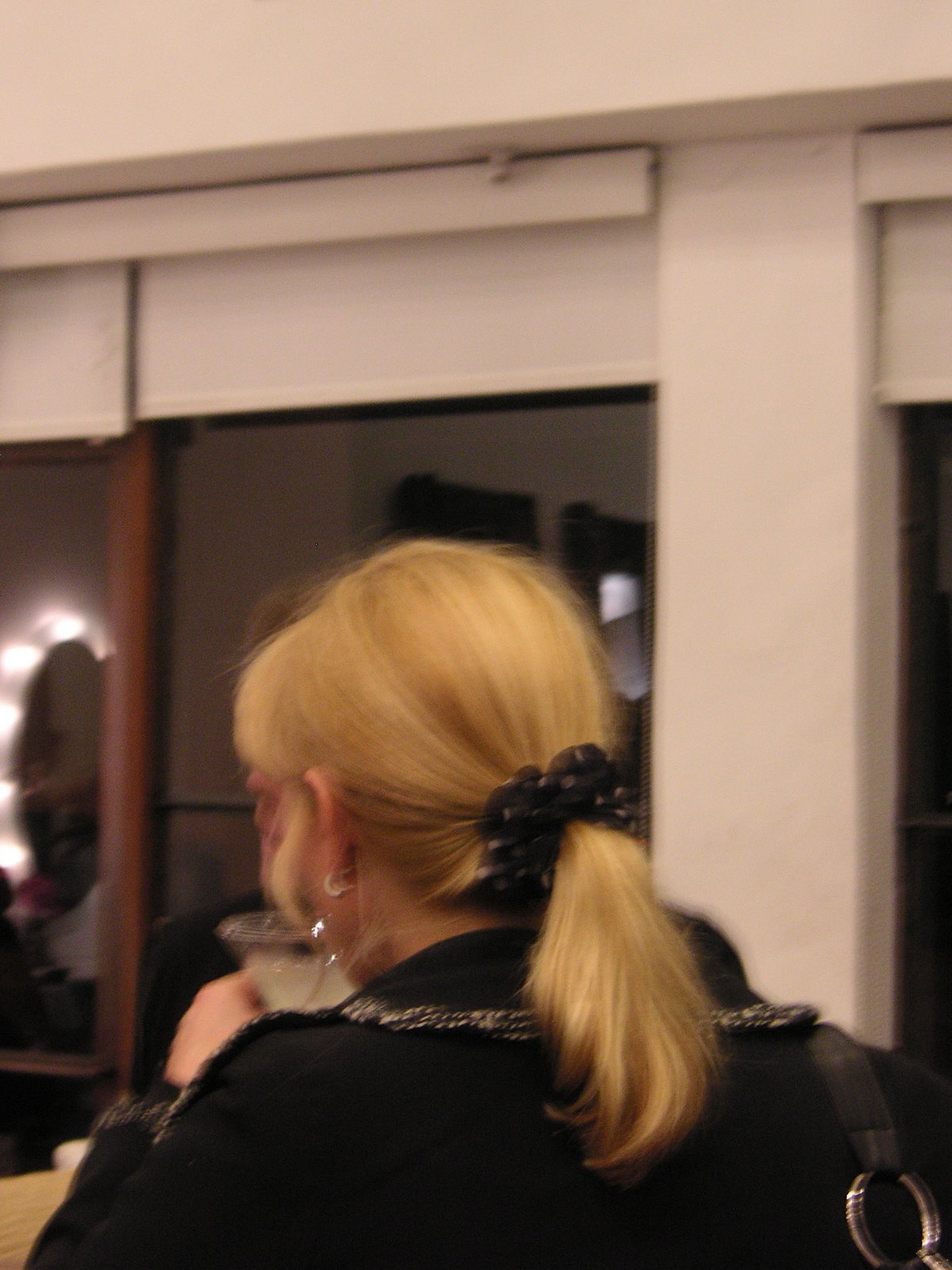 I saw the first sign that scrunchies might make a comeback last summer, when a vendor sold them on Ocean Front Walk in Venice. I didn’t really believe it. Then American Apparel started selling the hair accessory and there was no question that the scrunchie would be coming soon to a ponytail near you. I have no nostalgic pull to go out and get one. Some ’80s styles worked for me in the ’80s but won’t work for me now. Skinny jeans and leggings? Yes. Acid-washed skinny jeans and neon leggings? No. Faded and torn denim and Chuck Taylor sneakers? For sure! Shoulder pads and scrunchies? Hell no. Last night, at an event at a hair salon, I spotted the scrunchie in use (even better: a polka-dotted one). I was standing with a group of stylish women when it was spotted and I felt a little like my ’80s teen self as we all gawked and whispered and then giggled as I took this photo.