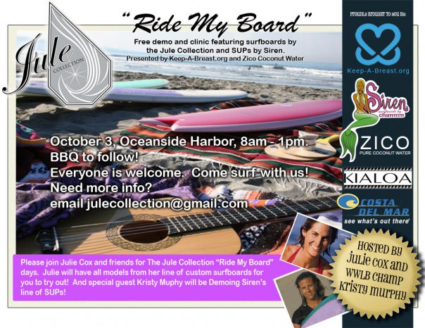 Two of my kick-ass surf camp instructors from Las Olas, Julie Cox and Kristy Murphy, are hosting a board demo and BBQ — “Ride My Board Day” — on October 3 in Oceanside Harbor. Julie designs the Jule Collection and Kristy is behind the Siren line of stand-up paddle boards. Email julecollection@gmail.com for more info.–Stef McDonald