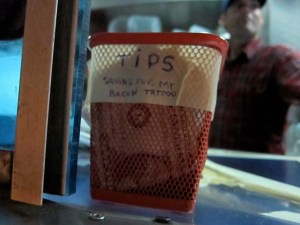 Posted on October 8, 2010January 6, 2014 by Stef McDonaldWill Tip for Bacon Tip jar on the counter of the Lardon food truck.