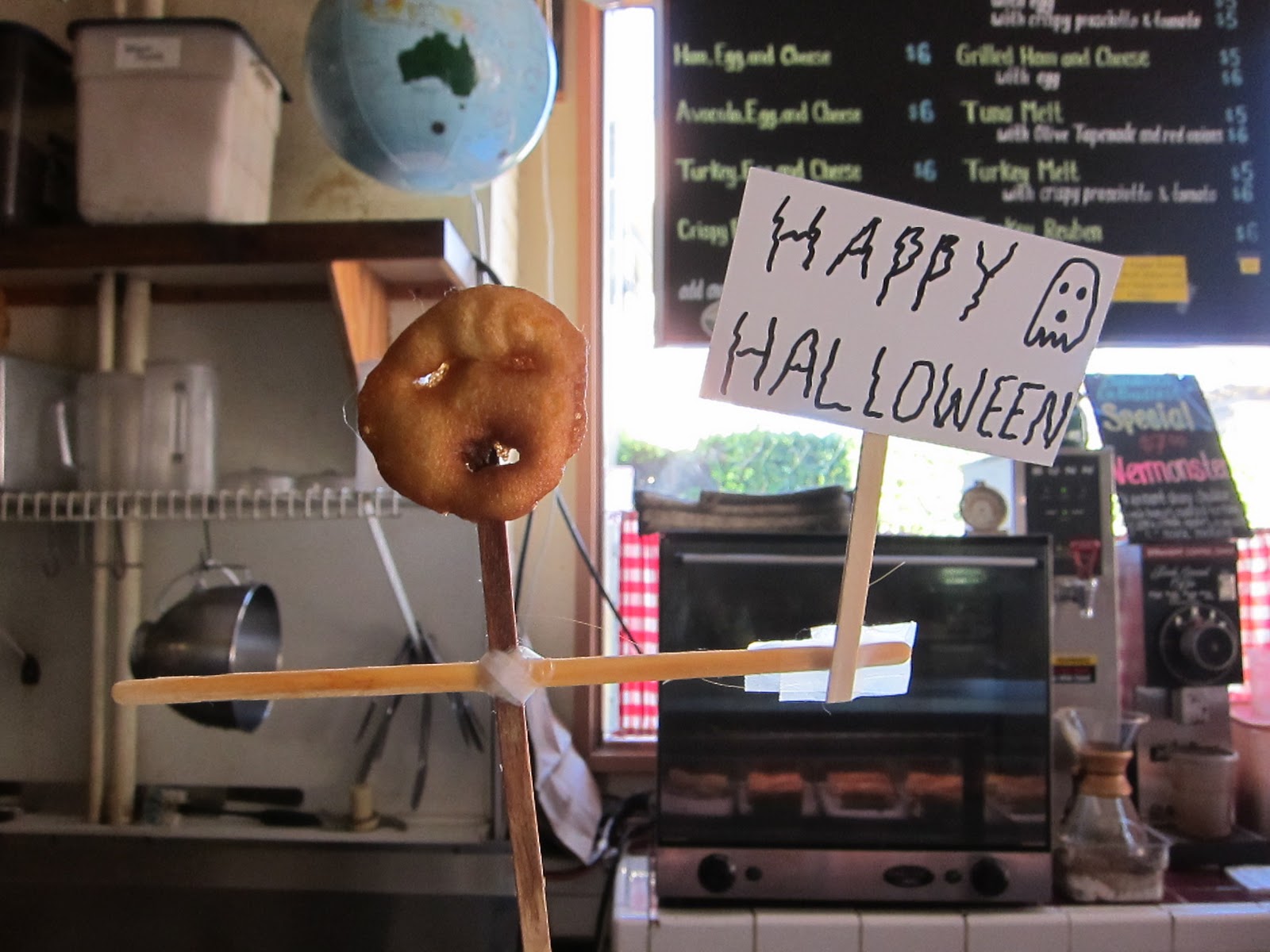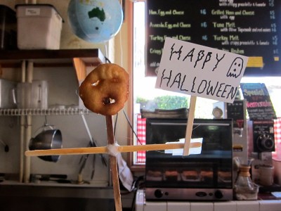 Posted on October 31, 2010January 6, 2014 by Stef McDonaldDonut Ghost: Happy Halloween Photo taken at Zelda’s Corner Deli in Venice Beach, CA.