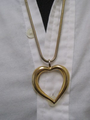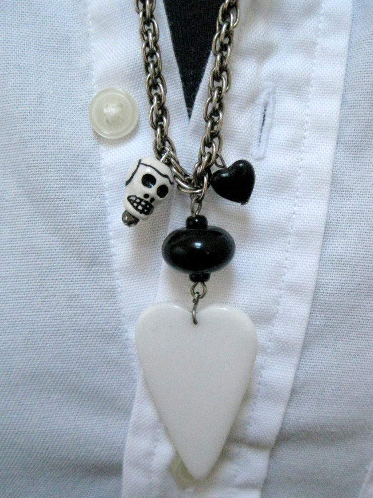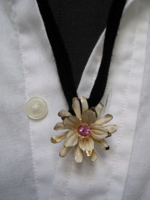 Some are vintage, featuring brooches, clip-on earrings, pendants, or charms hanging from the necklace. Others are upcycled, with single or multiple pieces from thrift store jewelry on the necklace. Sometimes the necklace has a chain from a thrift store necklace, and other I make the necklace using recycled material from black T-shirts (softer than a leather necklace; other colors available upon request). The necklaces made with the T-shirt material are 22-24 inches in length, but can be adjusted to be shorter or longer. You can wear one or layer two or more. I photographed the necklaces with a white button-down shirt, to show how they look styled with a shirt; I usually wear mine with my usual uniform of a tank or T-shirt under a cardigan or jacket.