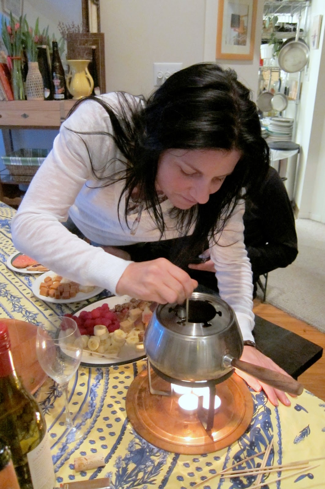 For our “Blood and Chocolate” Valentine’s Day dinner, we served steak for dinner and chocolate fondue for dessert. Guests brought the steaks: rib eye, New York strip, filet mignon, chuck roast. We added buffalo tri-tip to the mix. (Oh, it wasn’t all beef; we also had roasted root vegetables and a salad of mixed greens with pears, Pecorino Romano and crispy prosciutto.) Dessert was chocolate fondue (recipe from Eric Ripert via Food & Wine), with pound cake, toasted croissant, banana, raspberries, caramel, and sugar shortbread cookies for dipping.