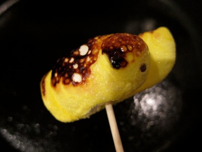 I’ve always been a fan of Peeps marshmallow treats and discovered that putting a flame to it gives it a sweet caramelized coating. I’ve toasted Peeps over a Weber grill and a fire pit; the one pictured here was toasted on a skewer over the flame of the gas stove.