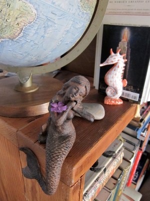 Posted on August 2, 2011January 27, 2017 by Stef McDonaldGive it a Try: Mermaid with Flower Purple flower in mermaid’s arms from the plant on our porch from the nursery guy who said, “Not sure if this plant will flower or if it will live, but plant it and give it a try.”