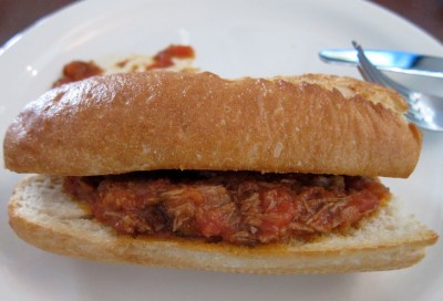 Making the sloppy joe stew: Chop a whole onion and a few cloves of garlic and saute in olive oil in a large stainless pot. Dice the steak and add it to the pot with a can of whole tomatoes, 1/4 teaspoon fennel seeds, and salt and pepper. Simmer on low heat for 3-4 hours. Serve on baguette. Enjoy.