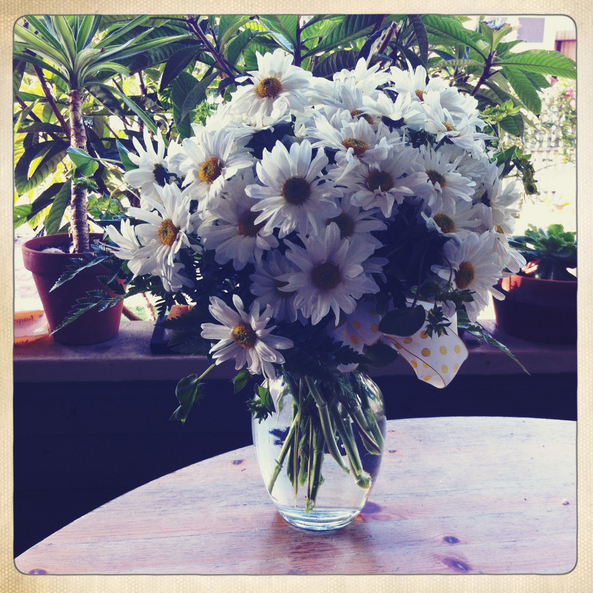 Posted on November 22, 2011January 27, 2017 by Stef McDonaldSo Pretty: Daisies, Just Daisies You can keep your roses. I like a bouquet of daisies. (And check out that yellow polka-dotted bow.)