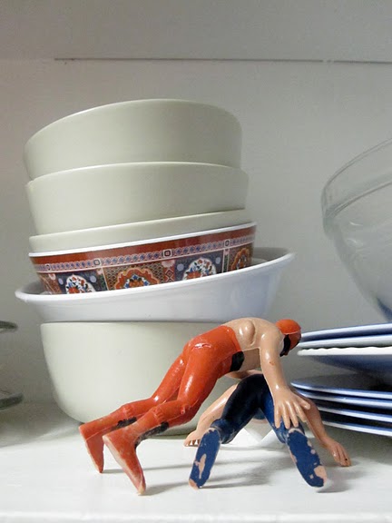 Photo of a shelf in a friend’s kitchen. The Mexican wrestlers were party favors from a wedding rehearsal dinner in Mexico. (More wrestlers photographed here.)