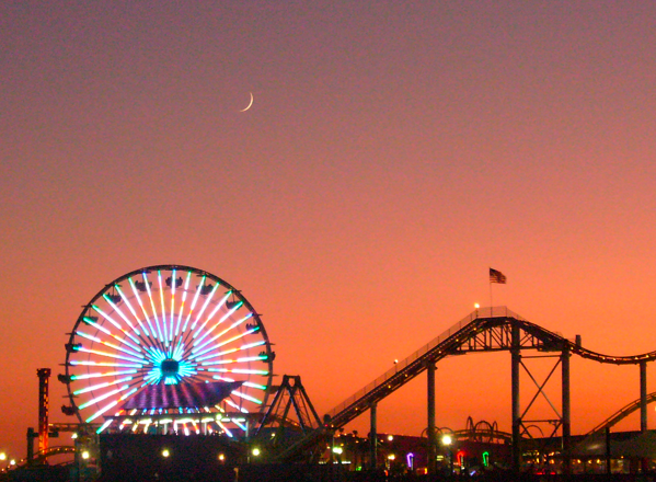 Tonight is the 100th anniversary celebration at the Santa Monica Pier, with music, fireworks, and other festivities. Above are some of my amateur pics of the pier, taken recently on one of those nights with a marvelously colorful sky. For truly remarkable photos of the pier, see my lovely and amazing friend Kristine Ambrose’s photos on her site. Her photos are at the Jeanie Madsen Gallery in Santa Monica, right across the street from the Pier (see her box of small prints below).
