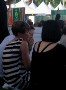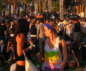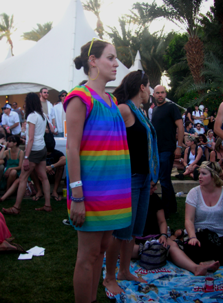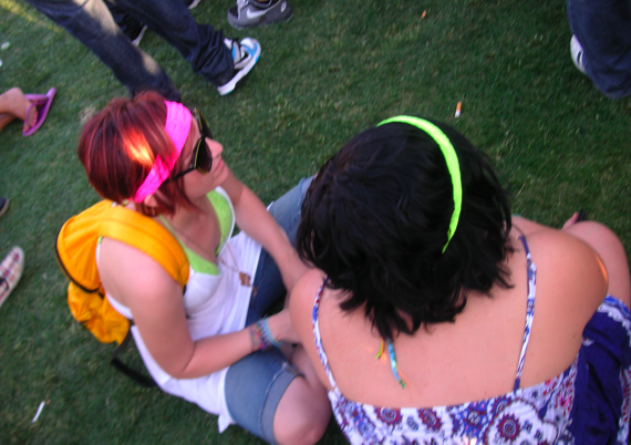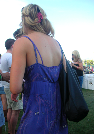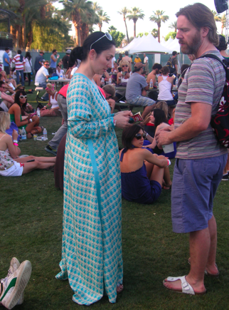 Going to the Coachella Music and Arts Festival is all about the music for me. I’m both proud and embarrassed to say that I ran into a friend and said, “Hi, no time for chit-chat, I gotta go across the field to see the next band!” When I saw another friend who came in for a hug, I said, “Sorry, too hot to hug! Let’s skip that.” (Okay, maybe I’m not so social when it comes to my rock and roll.) I saw dozens of acts and crossed the field often, but I also managed to amuse myself during trips from stage to stage by looking for fun fashions. It’s definitely a challenge to be stylish during the daytime in the desert and I’ve learned that you can choose the most sensible wardrobe choices and still sweat your buns off in 100-plus temperatures under a blazing sun. Remarkably, tons of stylish girls managed to dress to impress. I brought along my pocket digital camera and snapped a few shots (not Sartorialist-style because I took my photos passerby-style). Here, a woman in a pretty aqua caftan-robe-dress with skull print (she walked away from me before I could see it from the front and I didn’t notice the skulls on first glance). The other is wearing a dress with a bird print and coordinating feather hair clip (I like the bird and feather combination).