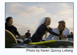 Got the link to this story from our friend Donna of Betty Belts. She’s acquainted with a couple that had their wedding ceremony in the water–while on their surfboards. How cool is it that the bride wore a wetsuit and a veil?–Stef McDonald