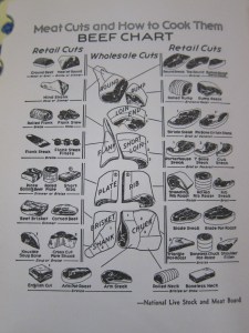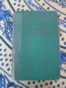 Dad picked this up at a yard sale for me: “The American Woman’s Cookbook” by Ruth Berolzheimer (1941). The cover is held on by tape, but it’s in otherwise great condition. Not surprisingly, I have been entertained by the dated material (certainly the section on “Entertaining Without a Maid” was good for a chuckle) and also a bit surprised by some of the recipes (see “Opposum Roast”). I plan to skip the recipe for braised calf’s brains with oysters and all the others for opposum, squirrel, reindeer, and pigeon (potted pigeon, pigeon pie, AND pigeon and mushroom stew). But the classic buttermilk waffles, chocolate cream pie, and pan broiled steak look mighty fine and there are some useful charts (like the one pictured on cuts of beef) and how-to instructions on basic cooking techniques that stand the test of time.